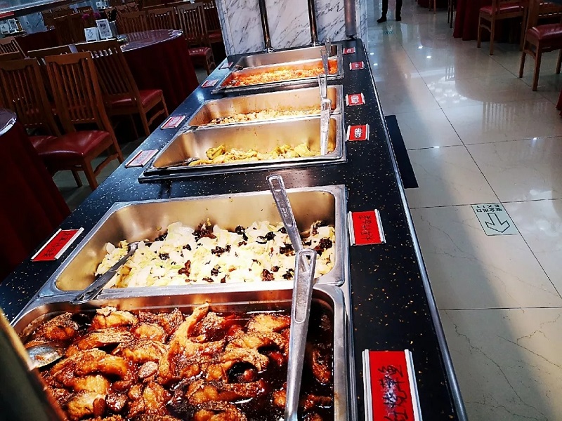 自助餐菜品分6種涼菜12種熱菜,葷菜有麻辣香鍋、虎皮青椒及紅燒草魚3種。